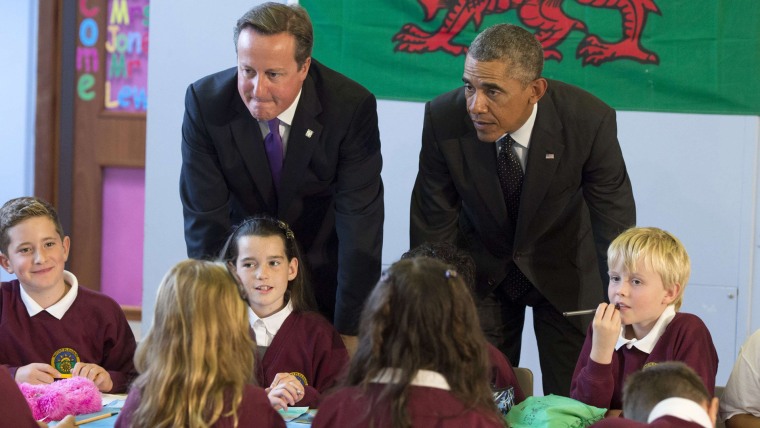 President Barack Obama kicked off his visit to Wales for the NATO summit Thursday with a trip to a local school alongside British Prime Minister David Cameron. Not everyone in the host city of Newport was pleased to see world leaders come to town, but the quiet residential street outside Mount Pleasant Primary School was packed with crowds behind a police cordon an hour before Obama and Cameron arrived in what the BBC reported was a 22-car convoy.