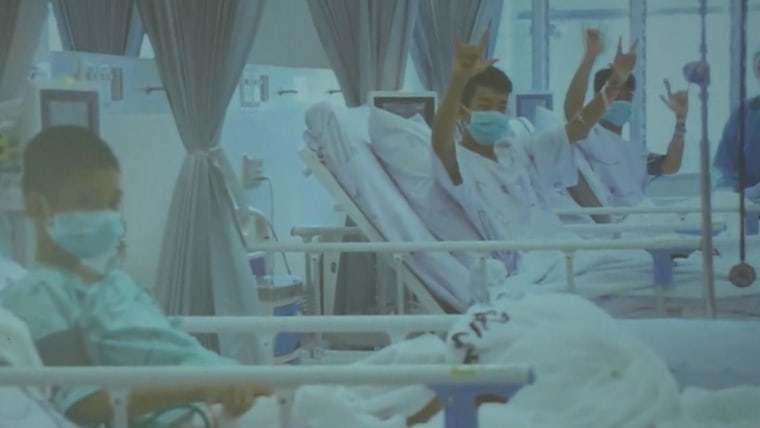 In video messages of the boys shown at a news conference on Saturday, they are seen wearing surgical masks, a safeguard against infection that's been taken since the last of them were pulled from the Tham Luang cave on Tuesday, ending an 18-day ordeal. Doctors said that Friday, when the videos were recorded, would be the last day they'd have to wear them.