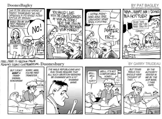 This week, the Salt Lake Tribune ran Garry Trudeau’s “Doonesbury” despite all the controversy surrounding its focus on a Texas law requiring women seeking an abortion to receive a sonogram. However, the paper’s editors decided against running today’s “I thee rape” strip. That didn’t sit too well with our own Pat Bagley, the paper’s staff cartoonist. He decided to take matters into his own hands and share his cartoon with today’s “Doonesbury” installment (the top part of the cartoon references Utah House Majority Leader Kevin Garn, who resigned after confessing to a nude hot-tubbing incident with an under-aged girl).