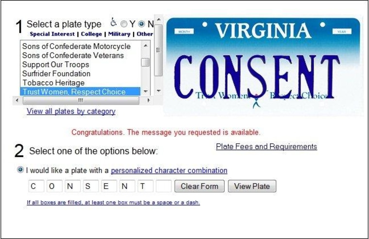 Across the bottom, the Planned Parenthood plate reads "Trust Women. Respect Choice," with no mention of state-mandated, medically unnecessary transvaginal ultrasounds. Virginia will, however, let you personalize your plate, with a few restrictions. Plates may not be "profane, obscene or vulgar," nor "sexually explicit or graphic," nor may they talk about ladyparts or man ones, nor may they be "socially" offensive. I'm not sure what that last part means, but the rules seem to leave plenty of room for creativity.