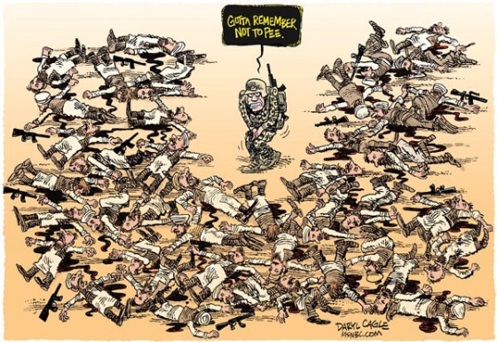But, if you kill everyone in the crowd, crowds are must easier to draw. There are no expressions, or body language. When I spend too much time drawing a dead crowd, I find myself thinking about the dead crowd cartoons again and again – maybe that’s unhealthy. In January I drew this cartoon about the Marines who peed on dead Taliban fighters.