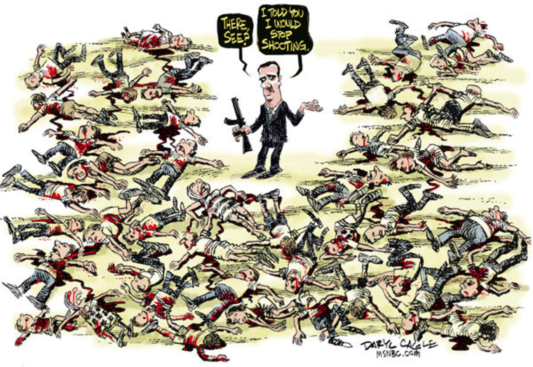 Now I want to draw President Obama in the middle of the dead crowd saying, “Things seem to have quietened down now, after my apology.” Maybe I will.