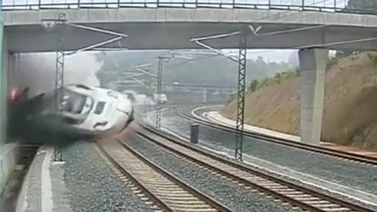 Security video showed the eight-car train derailing after speeding around a tight curve, hitting a wall with such force that one car caught fire and another mounted an embankment and came to rest on a nearby road.