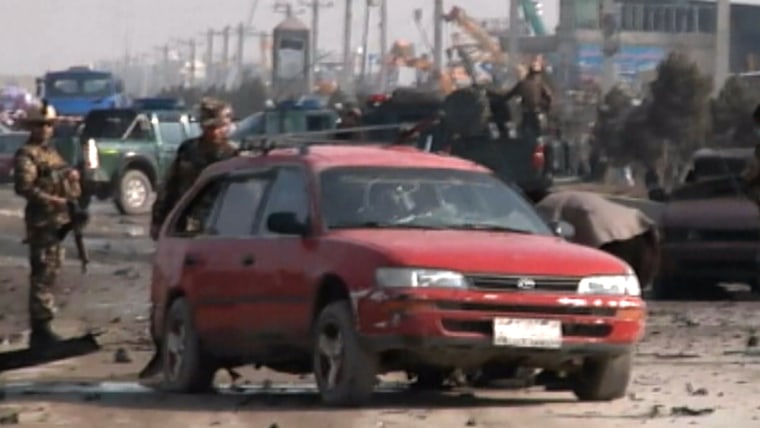 KABUL, Afghanistan — A suicide blast and gunfire rocked the embassy district of the Afghan capital Thursday, a local police commander told NBC News. Details of the attack were immediately unclear, but it came just hours after a U.K. embassy vehicle was hit by a suicide car-bomb, killing at least five people, including a British security guard. The second attack saw an explosion and gunfire break out blocks away from the U.K. embassy building, and the British Foreign Office told NBC News it was "monitoring closely."