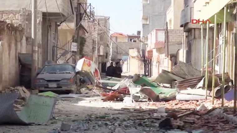 Rubble and mortar shells littered the streets of Kobani today in the aftermath of Kurdish fighters pushing militants out of Kobani. The Kurdish fighters were congratulated by pro-Kurdish parliamentarians from Turkey visiting the town.