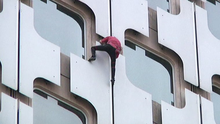 As onlookers watched, French 'Spiderman' Alain Robert climbs the 500-foot Ariane Tower in suburban Paris.