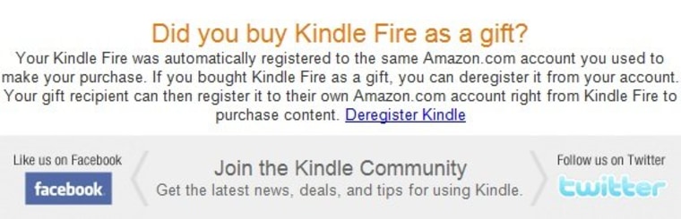 The only such alert we could find was a block of text located at the bottom of the order confirmation e-mail that states, “Your Kindle Fire was automatically registered to the same Amazon.com account you used to make your purchase. If you bought Kindle Fire as a gift, you can deregister it from your account. Your gift recipient can then register it to their own Amazon.com account right from Kindle Fire to purchase content.”