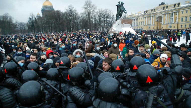 MOSCOW — Police detained more than 2,500 people and used force to break up rallies across Russia on Saturday as tens of thousands of protesters ignored extreme cold and police warnings to demand the release of Kremlin critic Alexei Navalny.