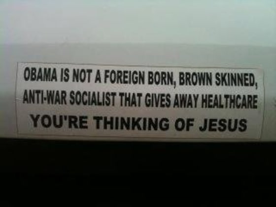 That other bumper sticker, the odious one, has been around awhile. We blogged a picture of one spotted in Nevada back in May 2011, and it didn't look new then.