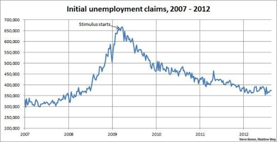 And with that, here's the chart showing weekly, initial unemployment claims going back to the beginning of 2007. (Remember, unlike the monthly jobs chart, a lower number is good news.) For context, I've added an arrow to show the point at which President Obama's Recovery Act began spending money.
