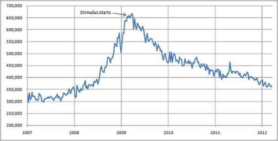 And with that, here's the chart -- which reflects the revised, seasonably-adjusted data -- showing weekly, initial unemployment claims going back to the beginning of 2007. (Remember, unlike the monthly jobs chart, a lower number is good news.) For context, I've added an arrow to show the point at which President Obama's Recovery Act began spending money.