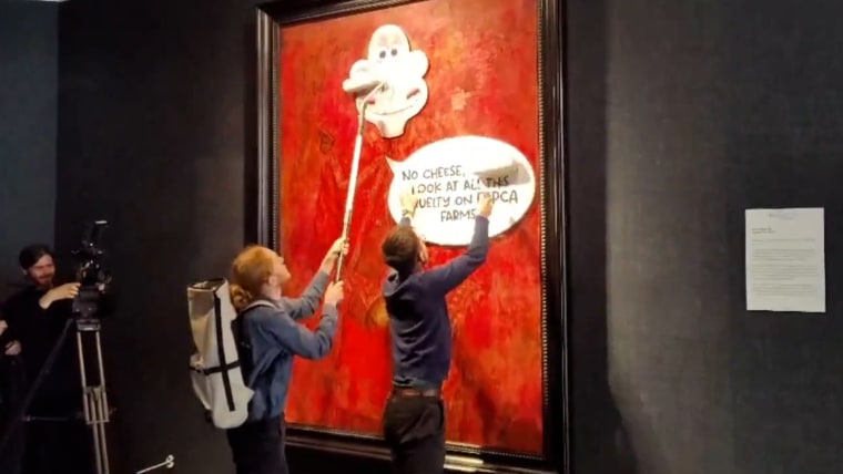 The Animal Rising group released video showing two of its supporters quickly approaching the painting and placing the head of Wallace, a character from the "Wallace and Gromit" animated franchise, onto the head of the monarch, to gasps of shock from onlookers.