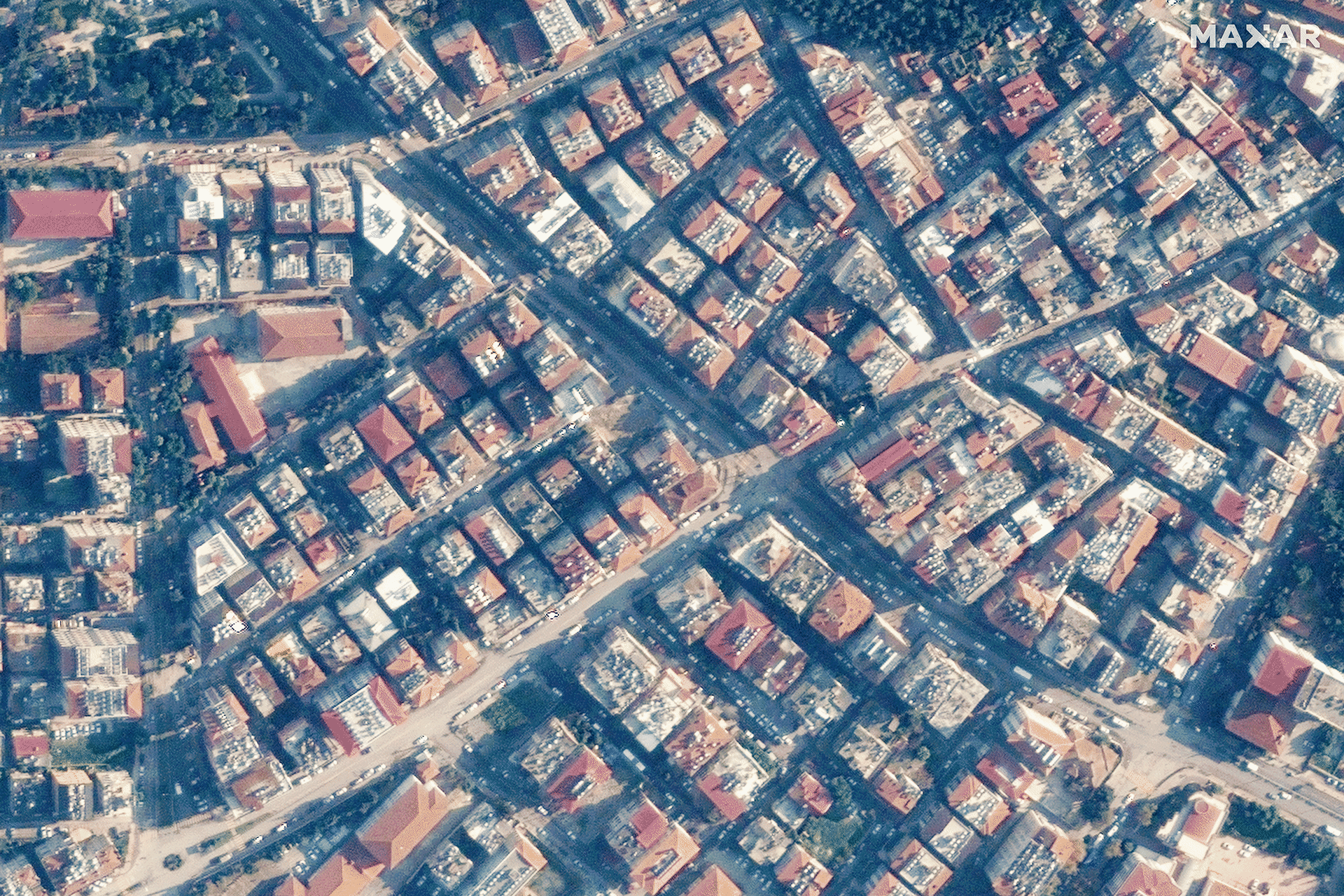 A before and after satellite view view of residential streets in Antakya, Turkey. Satellite image ©2023 Maxar Technologies