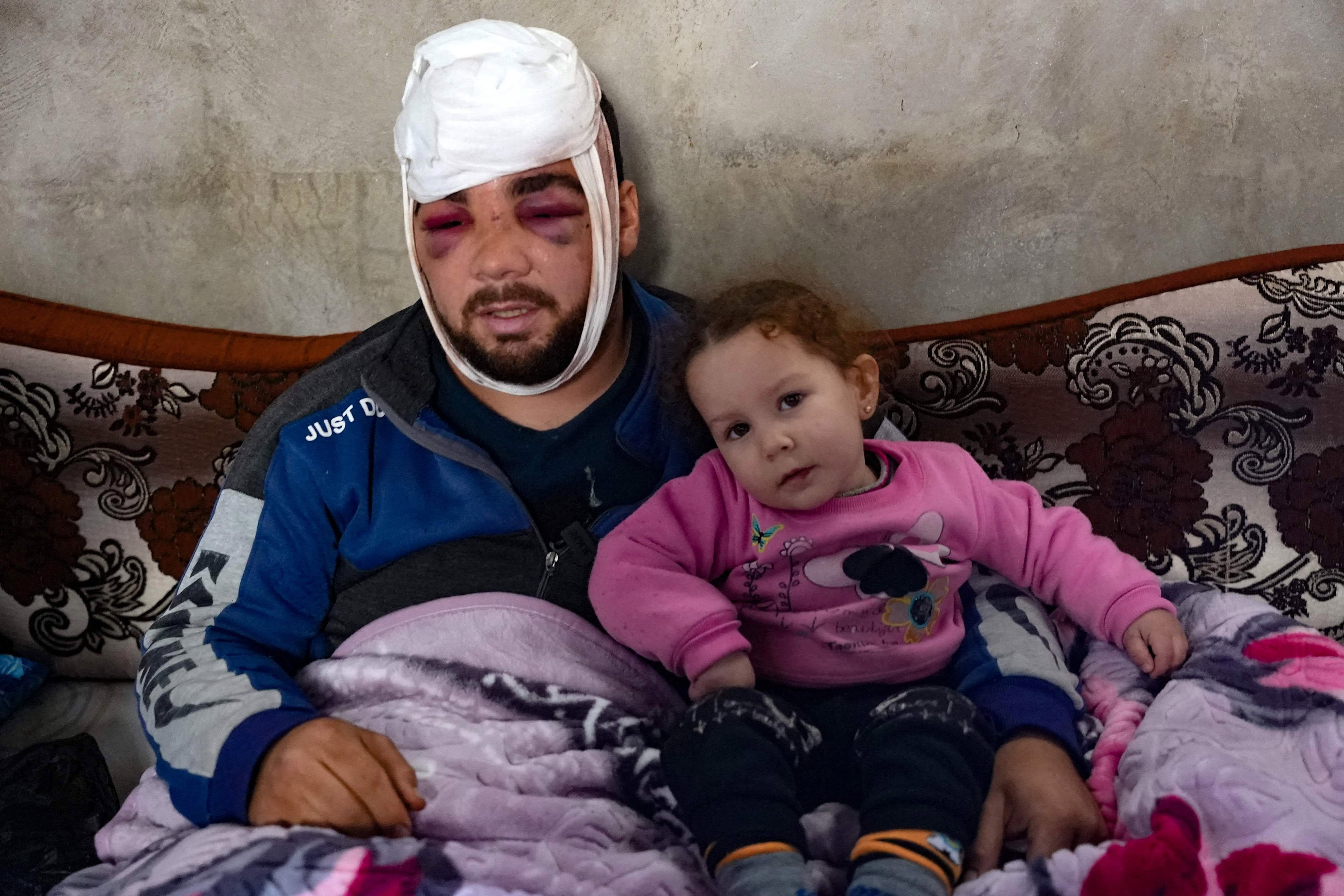 A Syrian man who was injured and left homeless in the deadly earthquake sits with a child in a makeshift shelter in the Deir Ballut camp in Aleppo province Wednesday.