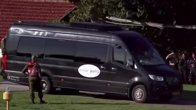 The hostages appeared to be wearing military uniforms and were taken to the stage for photographs, according to video footage from Reuters. The vehicles then set off accompanied by Hamas military escorts.