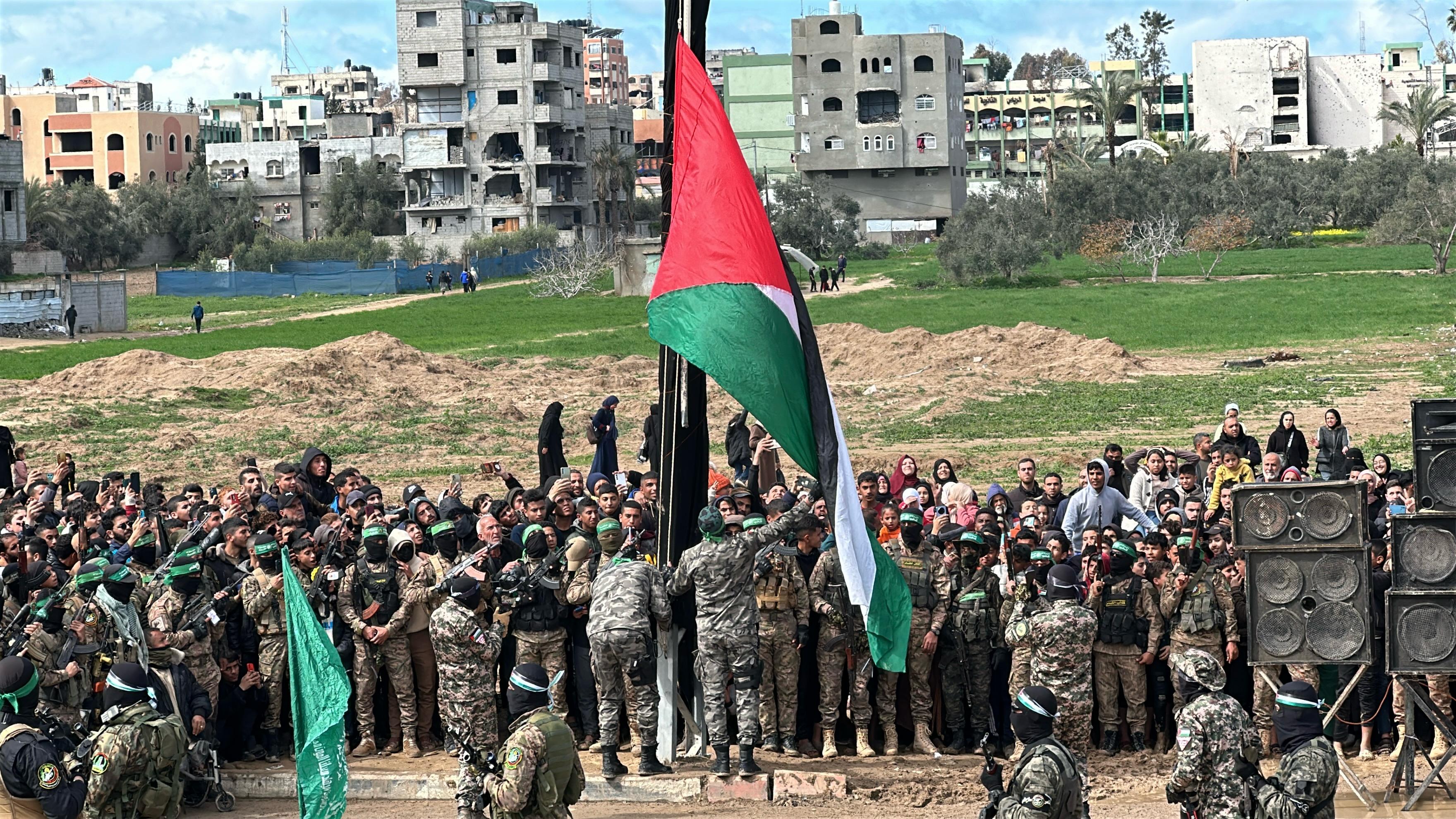 Moments before, the Palestinian flag was raised on a mast while the Palestinian national anthem was played, the first time this has happened at a hostage release.