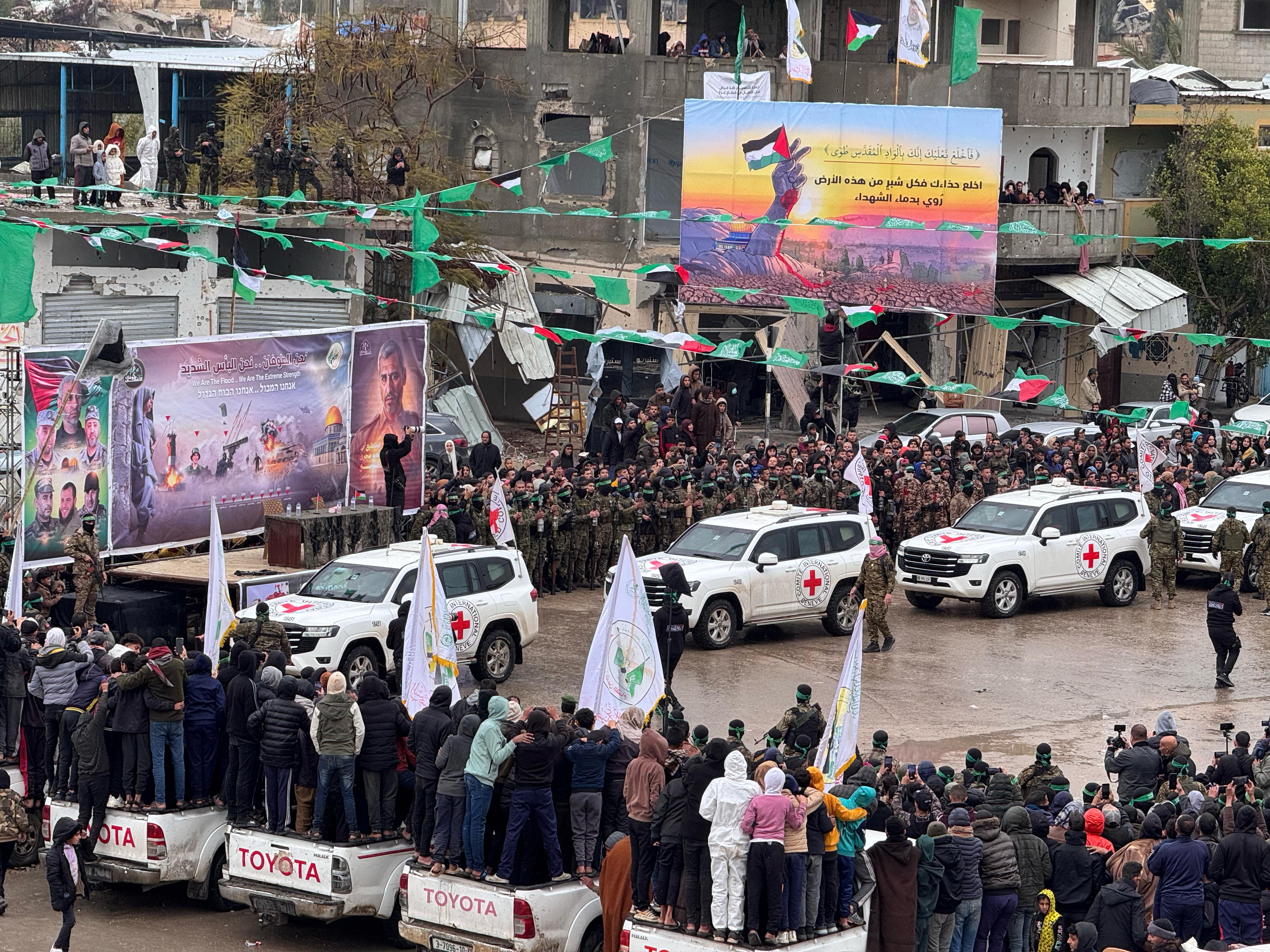 Palestinian fighters gather around stage for hostage release