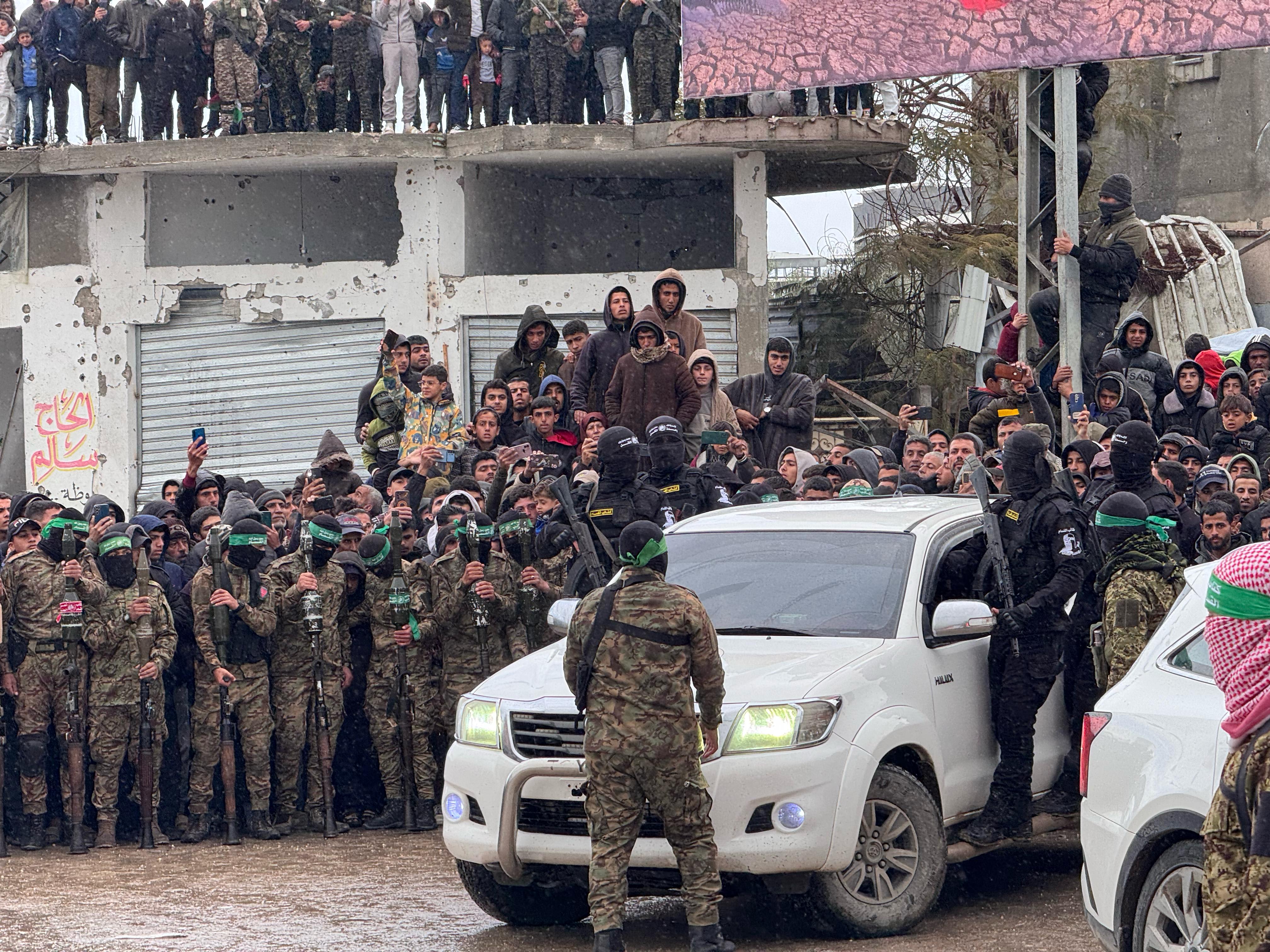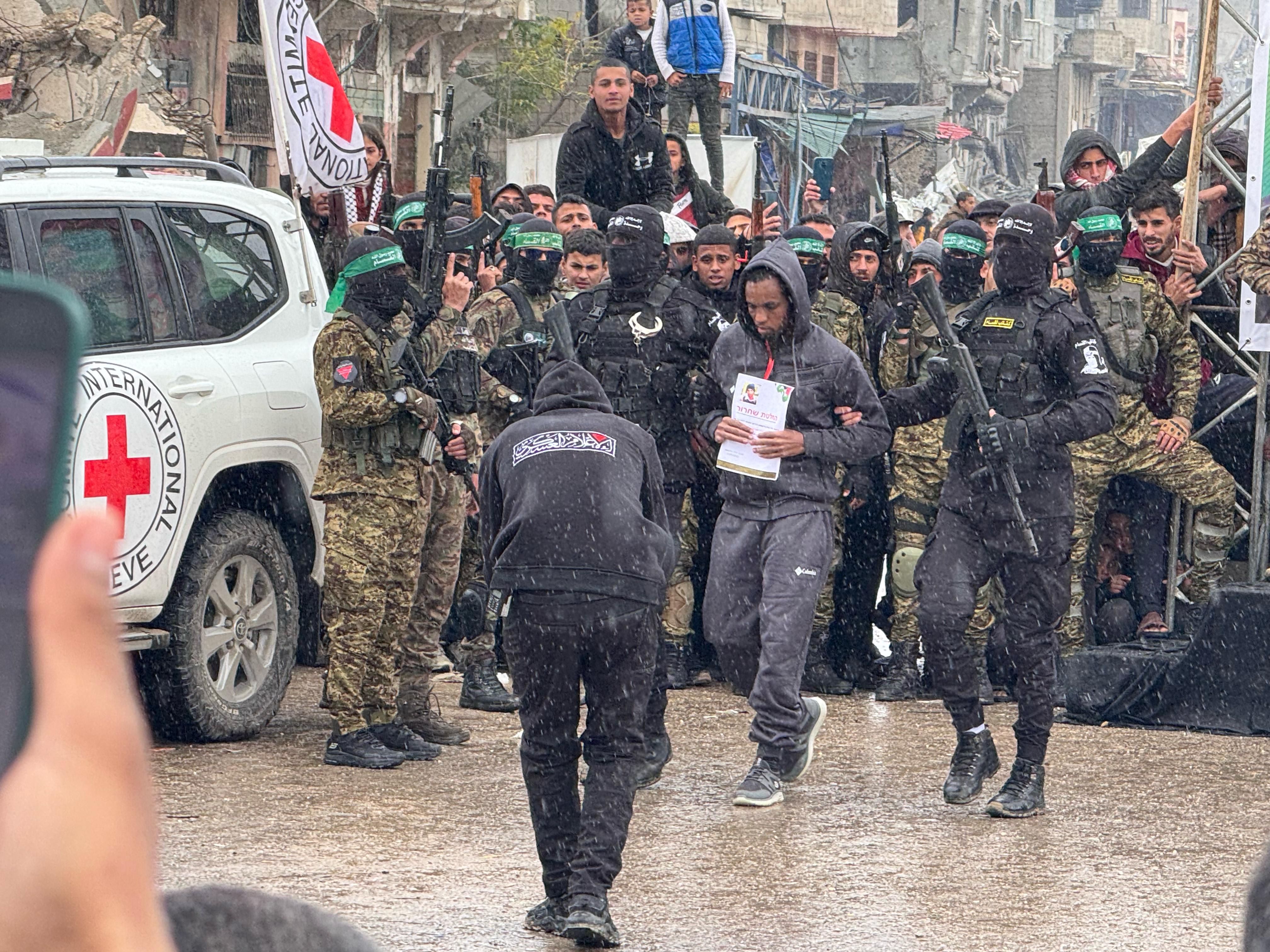 In Nuseirat, fighters have set up a similar staging arena, with dozens of Hamas fighters gathered to oversee the release and hundreds of civilian spectators, many of them wrapped in coats and sweaters in the wet weather.
