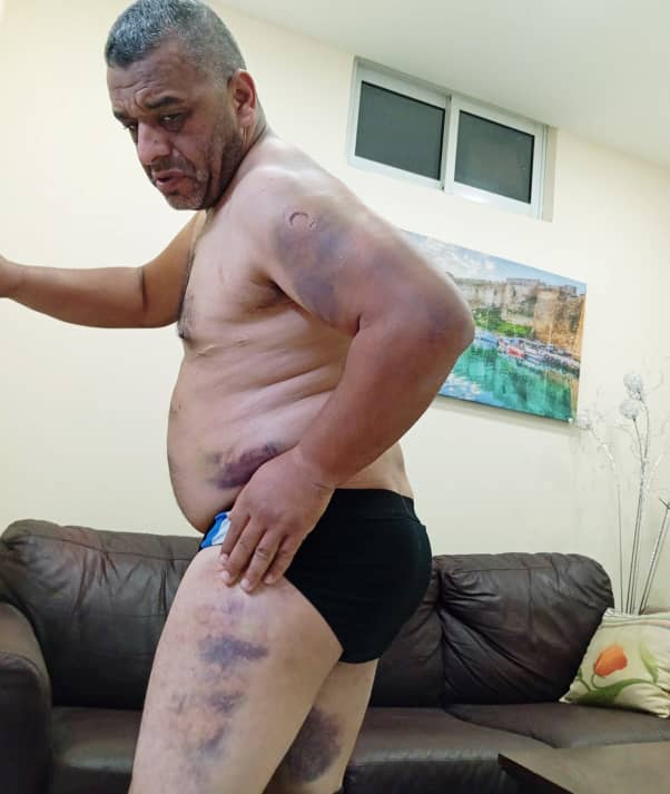 Mohamad Mattar shows bruises on his legs, arm and torso that he says are the result of a beating from Israeli soldiers and settlers in the occupied West Bank. Marc Smith / NBC News
