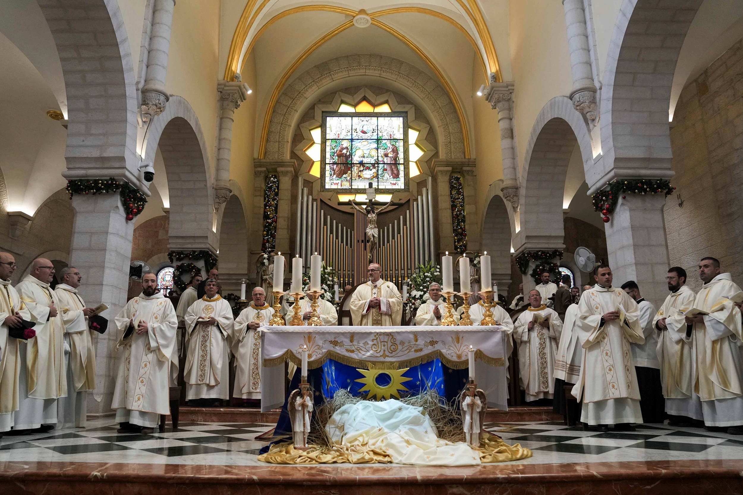 Latin Patriarch Pierbattista Pizzaballa leads the Christmas morning Mass at the Chapel of Saint Catherine. Mahmoud Illean / AP