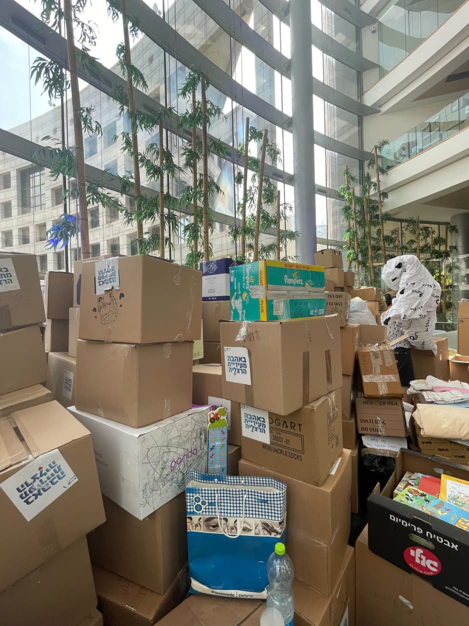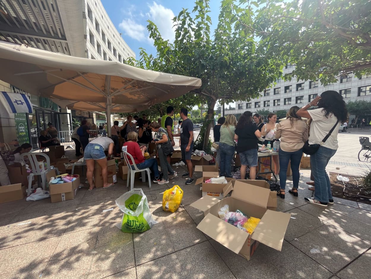 Children’s clothing could be seen stacked in boxes, alongside toiletries and fresh clothing for soldiers outside Herzliya City Hall.