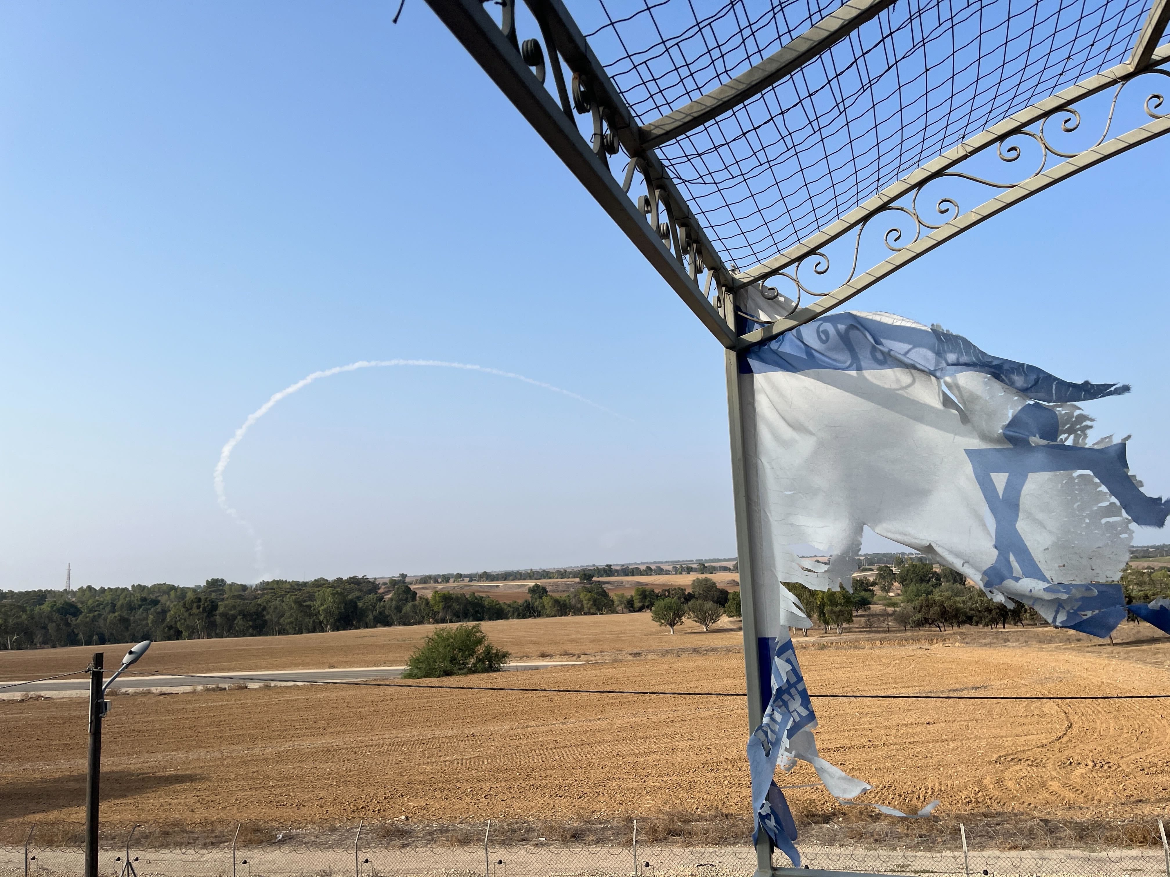 From a roof terrace in Re’im, where the Supernova music festival was also held, the rocket arced through the hazy morning sky, making a whooshing sound, leaving a trail of smoke and followed by a distant thud. The rocket was destined for another part of Israel, further north, and no alarms sounded here.
