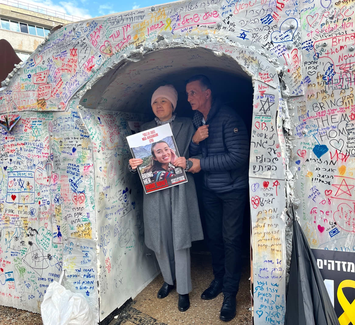 “I miss her a lot. One hundred days is enough,” she told reporters after walking through a tunnel set up in the plaza to re-create the conditions those held hostage by Hamas are living in. “We suffered a lot.”
