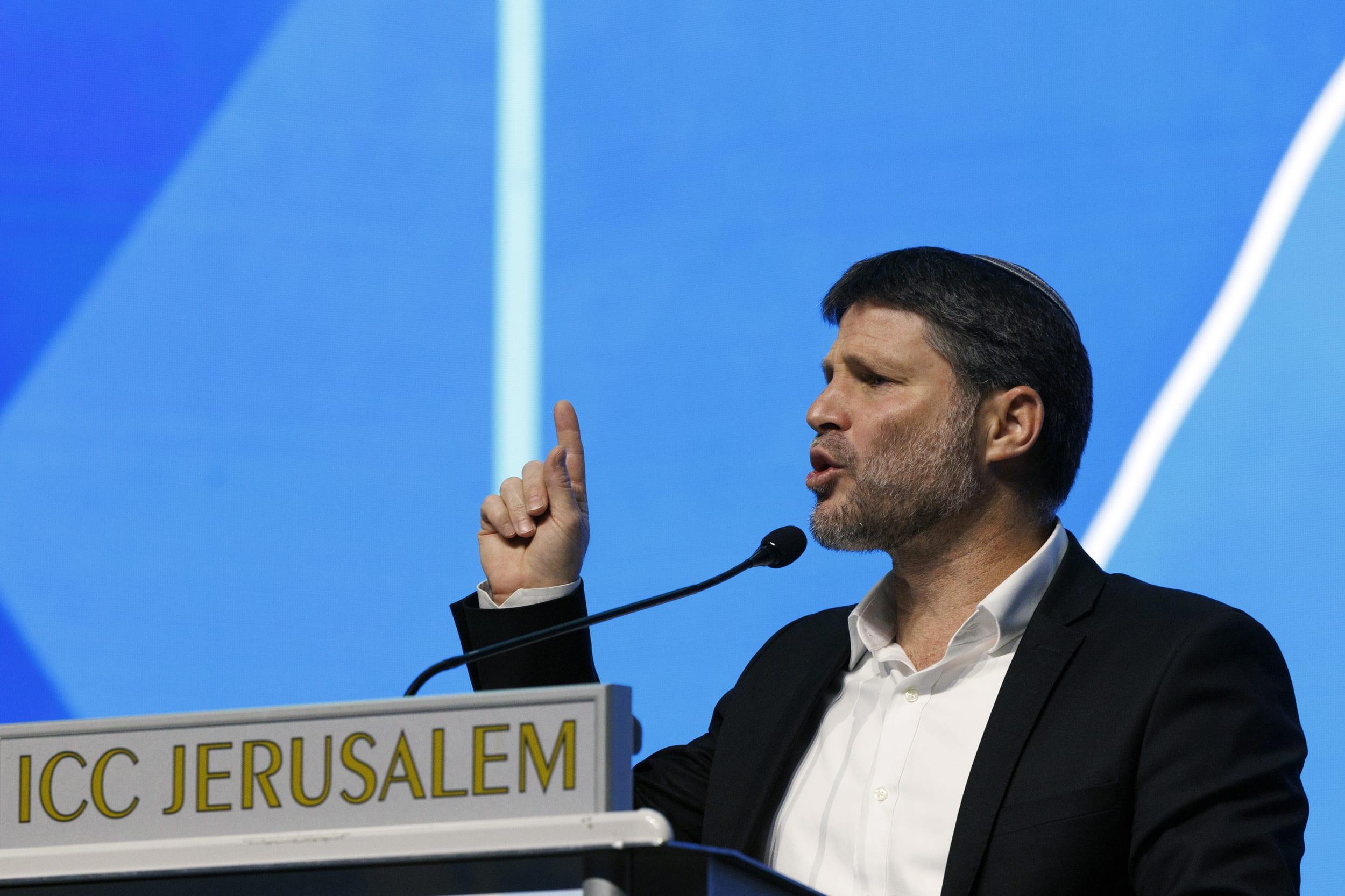 Finance Minister Bezalel Smotrich speaks at a resettlement conference in Jerusalem on Sunday. Kobi Wolf for NBC News