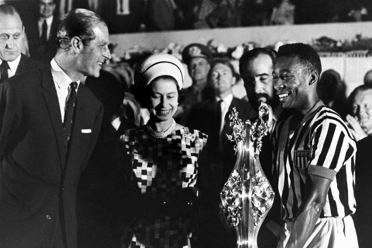 Queen Elizabeth II and her husband, Prince Philip, smile as they give a cup to Pele, right, at a soccer stadium in Rio de Janeiro, on Nov. 10, 1968. AP file