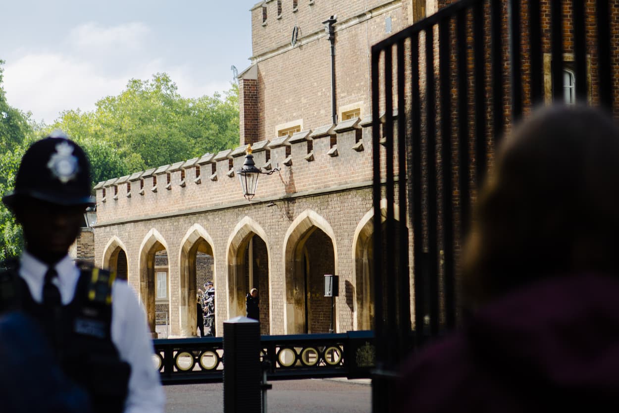 National anthem and cries of 'God save the king' outside St. James's Palace