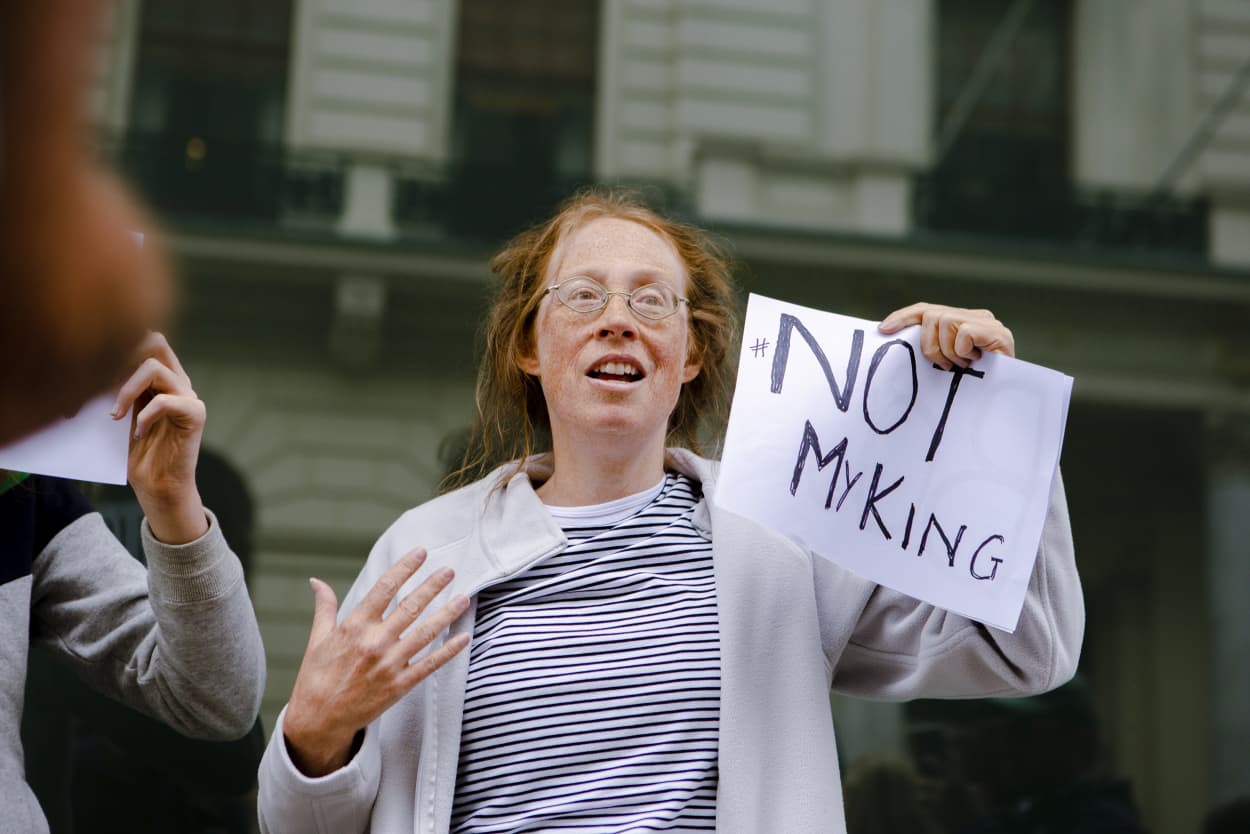 A protester holds a "Not my king" sign outside St. James's Palace as King Charles III is proclaimed the new monarch. Amara Eno for NBC News