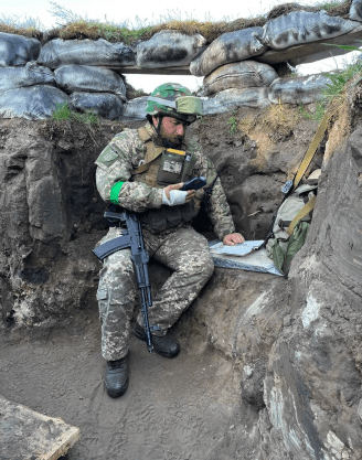Fedir Shandor takes a video call in a combat zone of eastern Ukraine. Viktor Shchadei / Uzhhorod National University