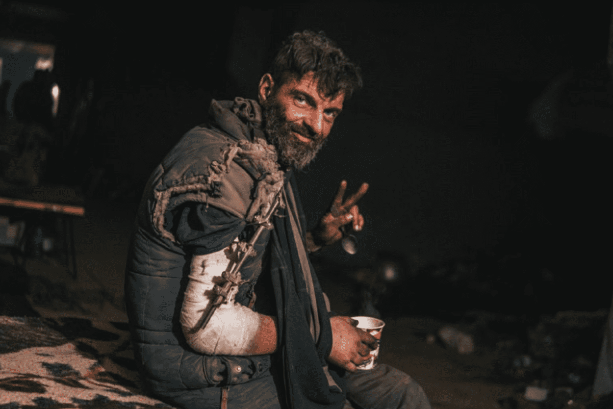 A wounded Ukrainian soldier sits below the besieged Azovstal steel plant in Mariupol on May 10, 2022. Courtesy of Orest Kozatskyi