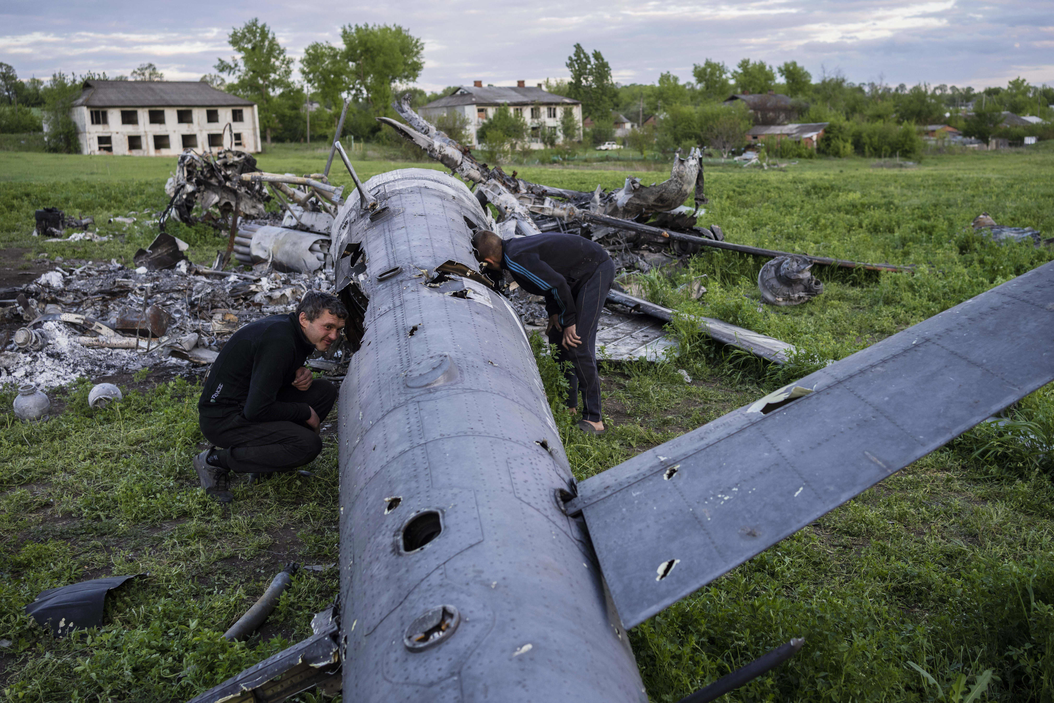 Local residents check the remains of a destroyed Russian helicopter in the village of Malaya Rohan, Kharkiv region, Ukraine, on May 16, 2022. Bernat Armangue / AP