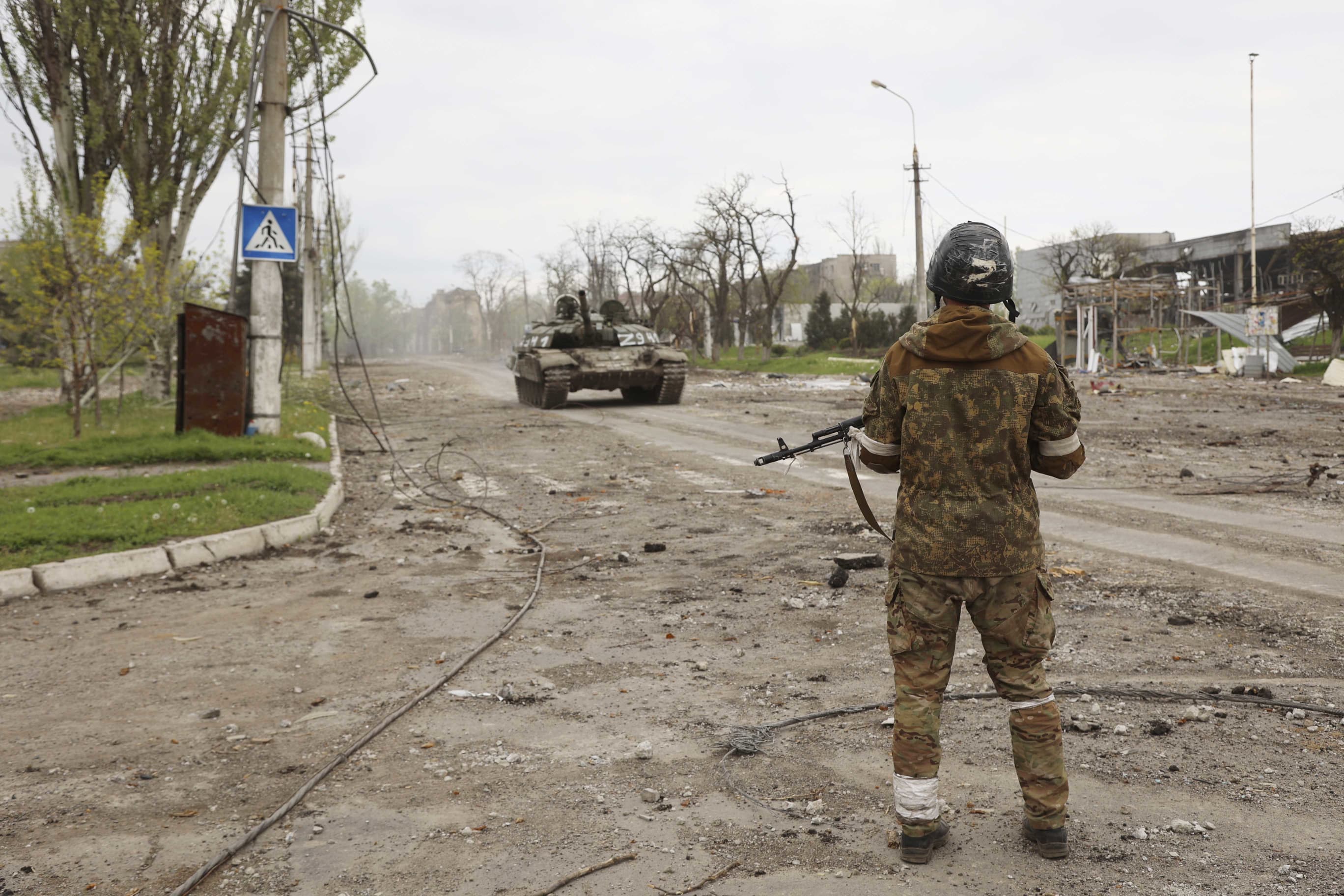 A separatist soldier from the Donetsk People's Republic stands at a check point in Mariupol on May 4, 2022. Alexei Alexandrov / AP