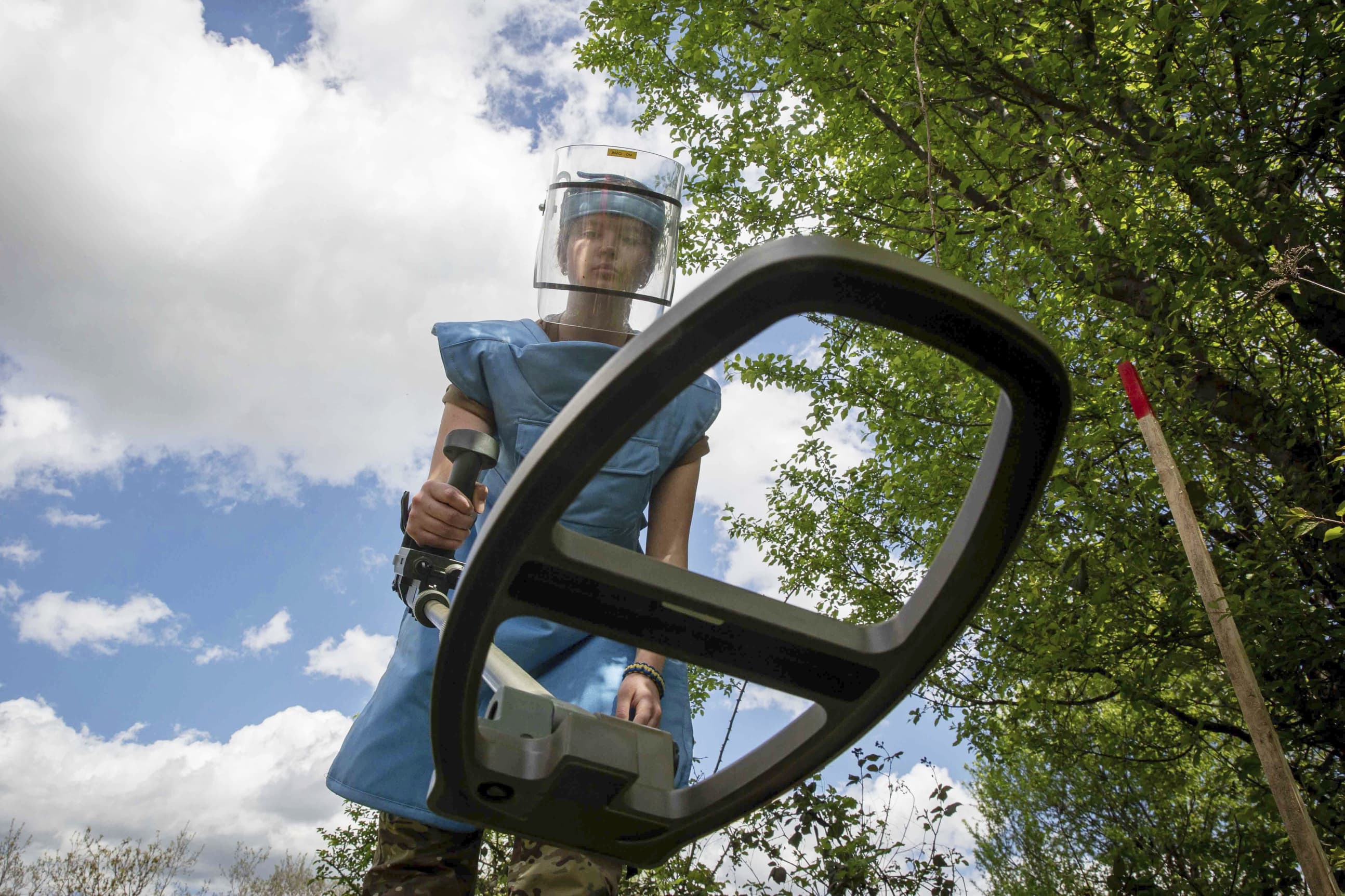 Anastasiia Minchukova sweeps with a mine detector during a training session for a group of Ukrainian female emergency services personnel in the western Kosovo city of Peja on Monday. Visar Kryeziu / AP