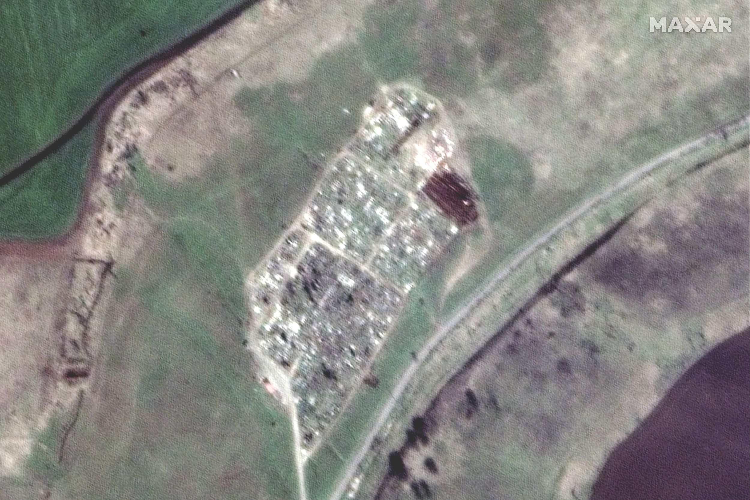 An overview of a possible mass grave site on the northwestern edge of Manhush, about 12 miles west of Mariupol, on April 3 from U.S. defense contractor Maxar. Maxar Technologies / AFP - Getty Images