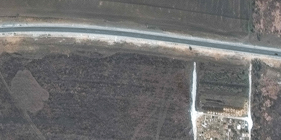 A satellite view of an apparent expansion of graves at a cemetery in Vynohradne, Ukraine, on April 15. Satellite image ©2022 Maxar Technologies