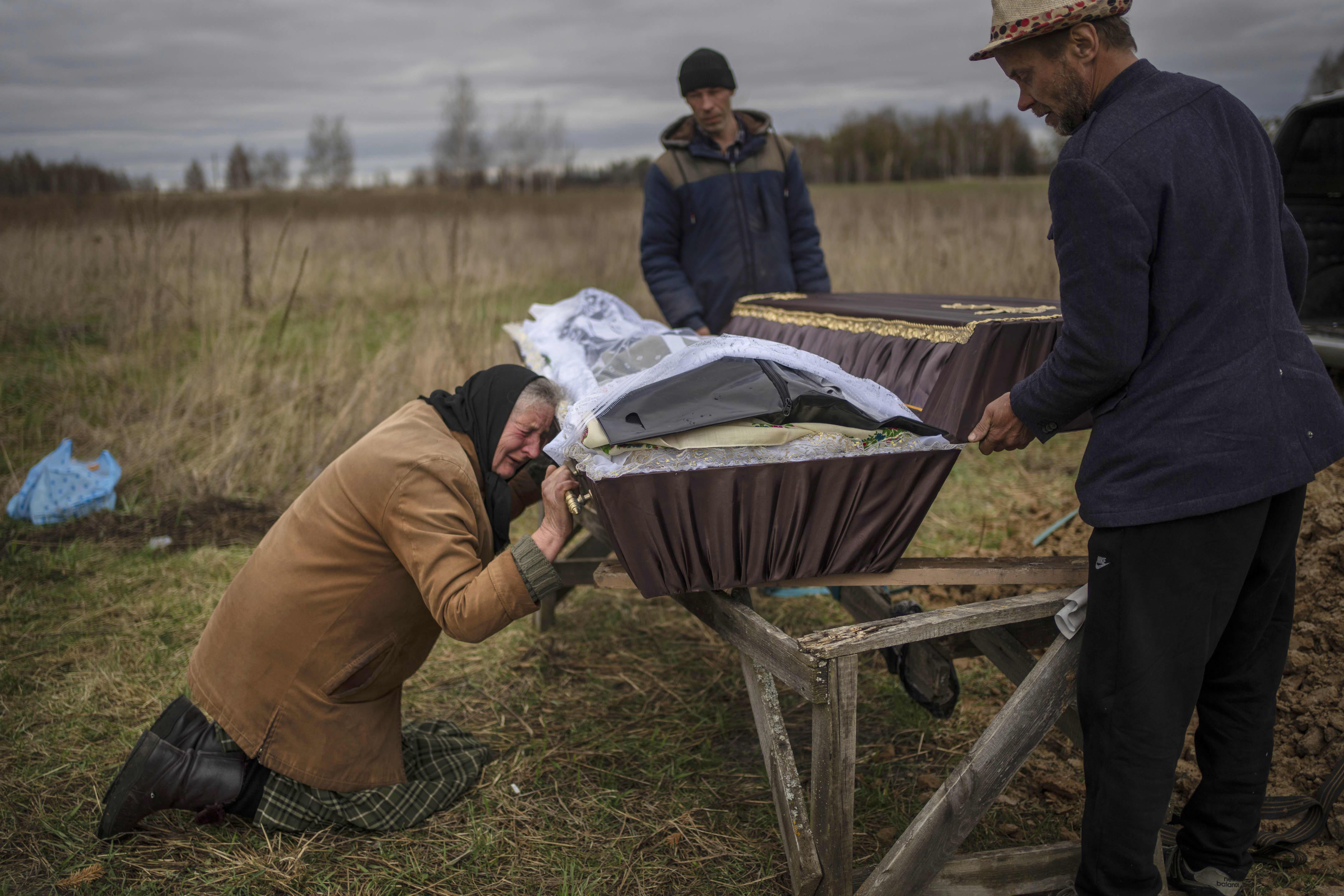 Nadiya Trubchaninova, 70, cries while holding the coffin of her son Vadym, 48, who was killed by Russian soldiers in Bucha, during his funeral in the cemetery of Mykulychi, on the outskirts of Kyiv on April 16, 2022. Rodrigo Abd / AP