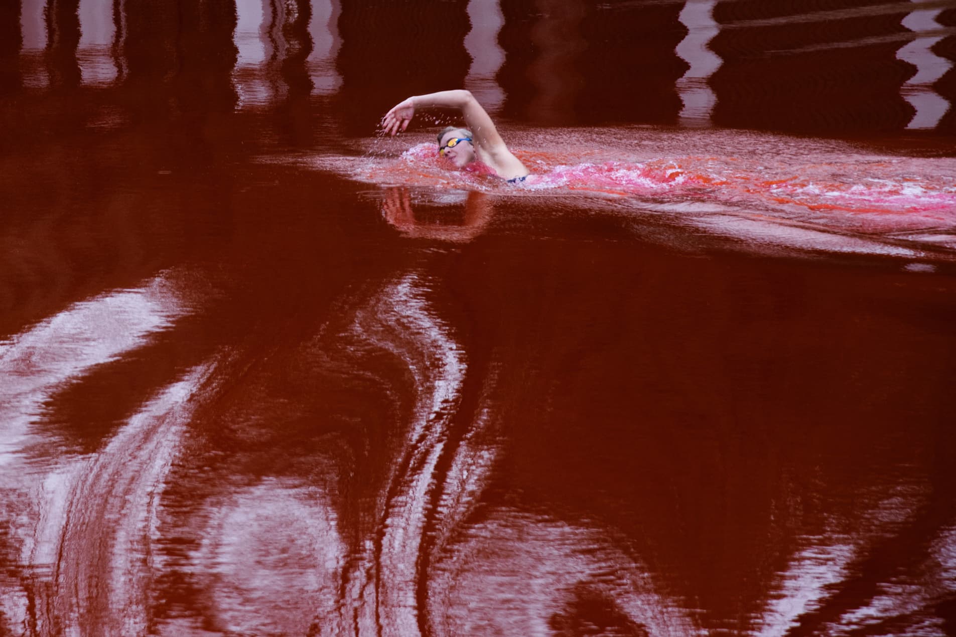 Olympic and world champion Ruta Meilutyte swims across a pond colored red to signify blood, in front of the Russian embassy in Vilnius, Lithuania on Wednesday.
