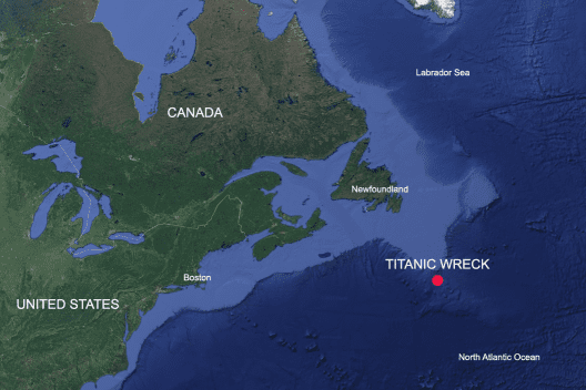The Titanic wreck is located around 370 miles off the coast of Newfoundland, Canada in the North Atlantic Ocean. It sits on the ocean floor in two main sections at a depth of about 12,500 feet.