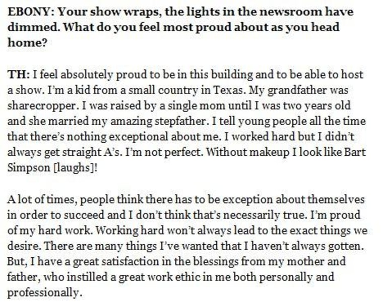 In a recent interview with Ebony.com, MSNBC's Tamron Hall talks about her career progression, her humble beginnings in Luling, Texas, her family life, and what she enjoys most about her job at NBC. Below is an excerpt - you can read the full article (interview by Kristin Braswell) on the Ebony site.