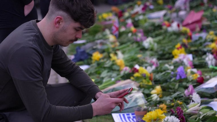 Outside the castle, international journalists jostle for space, police ensure mask-wearing crowds maintain social distance and children loll beside their parents. The Union Jack flies at half-staff, while another indicates the queen is in residence. Her son and heir to the throne Prince Charles visited his mother at the castle on Friday, a palace spokesperson told NBC News.