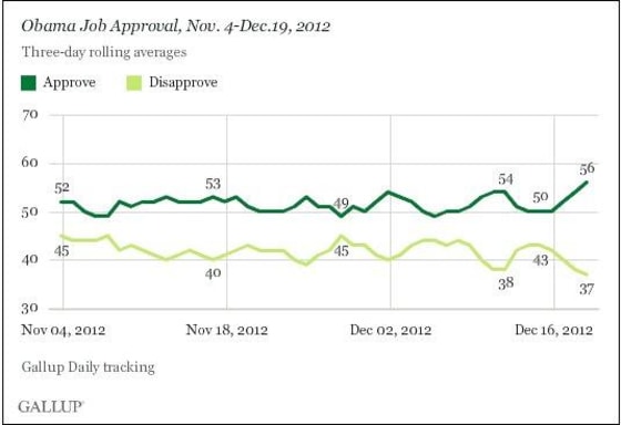 The latest Gallup poll released yesterday was no doubt welcome news at the White House: "President Barack Obama's job approval rating has risen to 56%, by two percentage points his highest three-day reading since October 2009."