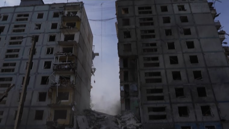 Tetyana Lazunko, 73, and her husband, Oleksii, took shelter in the hallway of their top-floor apartment after hearing air raid sirens. The explosion shook the building and sent their possessions flying. Lazunko wept as the couple surveyed the damage to their home of nearly five decades.