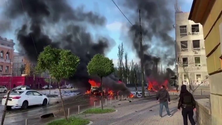 NBC News heard loud explosions in the morning, and witnessed a big crater apparently left by a rocket in the city’s central Shevchenkivs’kyi district, leaving surrounding buildings battered with shrapnel and windows shattered. Images and videos verified by NBC News showed incinerated cars and a crater near a playground in a city park.