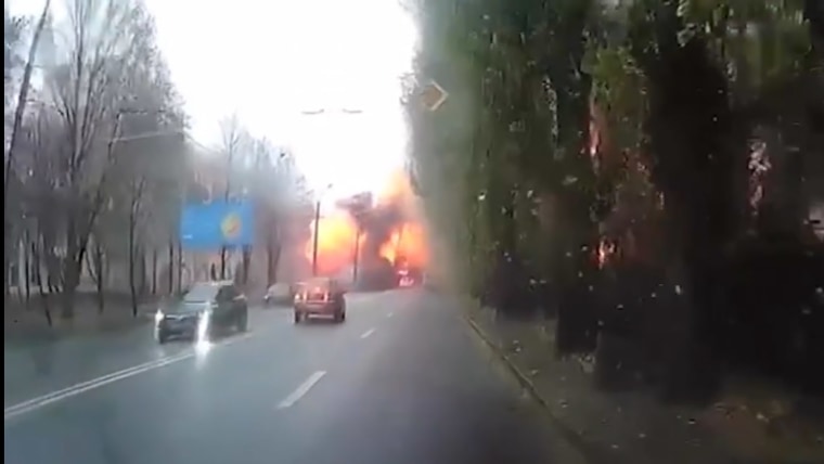 Ukrainian President Volodymyr Zelenskyy posted on Telegram a video that he said was one of the blasts in Dnipro. The video from a vehicle dashcam shows a fiery blast engulfing a rainy road.