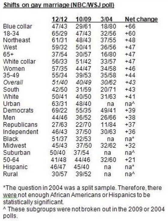 While that 47/43 split shows blue-collar workers are far less supportive of gay marriage than Democrats (69/22), highly educated (66/28), young (65/29), or urban voters (63/31), it does represent a net change of 66 points – more than any other demographic subgroup since 2004.