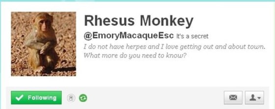 Unlike the Mystery Monkey of Tampa Bay, who's been on the lam with his own Facebook page for over a year, the Emory University research primate avoided the world's largest social network, no doubt because of its reputation for shutting down suspicious profiles or tracking its users every move. Instead, the fugitive monkey took a cue from @BronxZooCobra and went with Twitter. Tweeting under the name @EmoryMacaqueEsc, she's been microblogging her adventures since Thursday. The monkey had a humble 186 followers at the time of this post, a number that will no doubt rapidly rise. (Who doesn't love a tweeting monkey?)