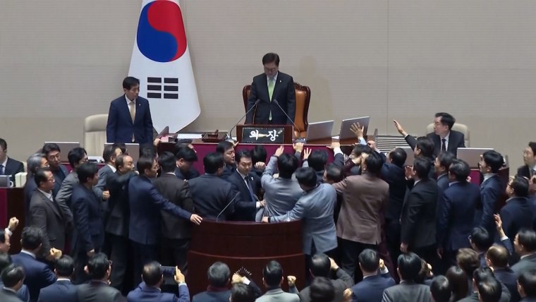 The ruling People’s Power Party surrounded the speaker’s podium following the vote to impeach acting President Han Duck-soo, chanting that the vote was invalid and accusing parliament of committing “tyranny.”